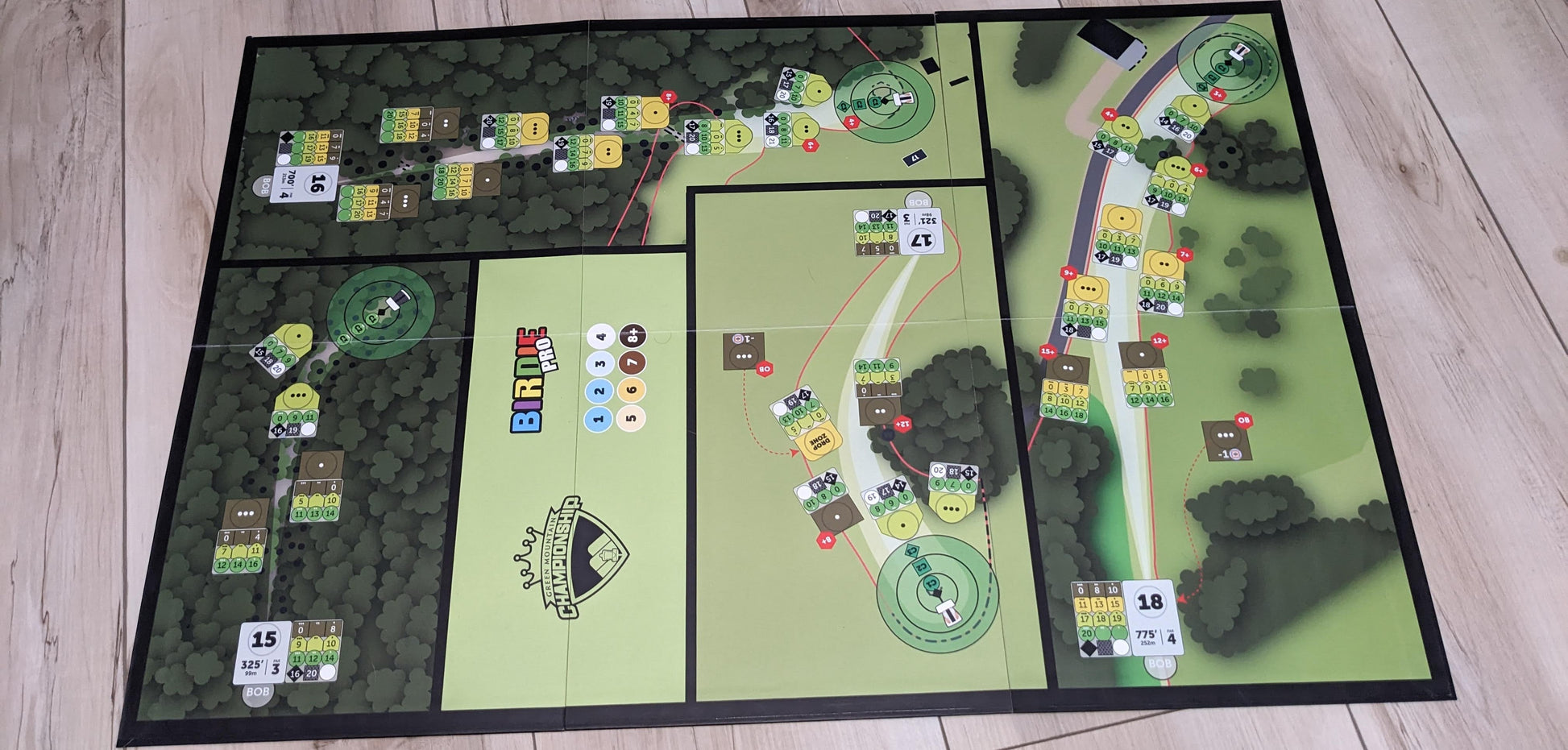 The boards utilize the DGPT tee signs so they are as true to life as possible. UDisc stats are used to create the roll charts for each space on the board. If the pros are likely to go out of bounds, you may want to focus.